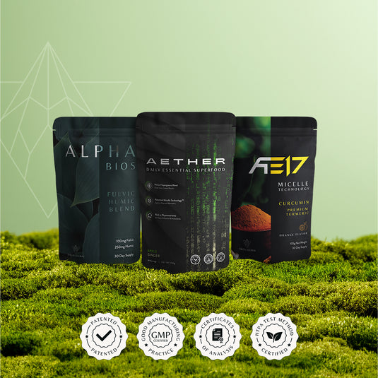 Experience a holistic boost to well-being with The Rapha Bundle, featuring four potent products. Alpha Bios introduces Fulvic and humic acids for potential health benefits, contributing to overall well-being. AE17 V2, the ultimate turmeric extract, ensures unmatched bioequivalence with a convenient Micelle flake formula, propelling you towards optimal health. Aether, our daily essential superfood, delivers advanced nutrient support powered by Micelle Technology™, helping you absorb more of what your body needs to thrive.